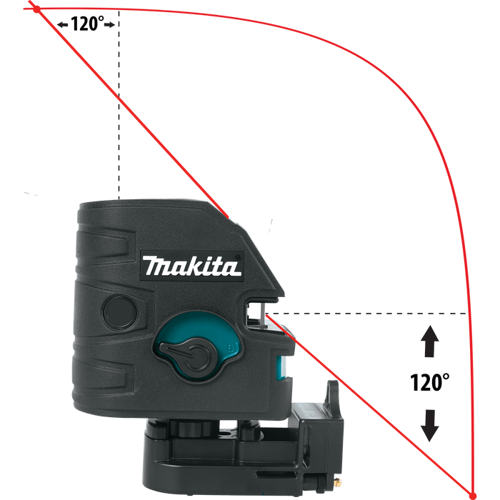 • Laser line fan length spans well past 90° position to provide 180° horizontal line and 120° vertical line for full reference line coverage in demanding applications